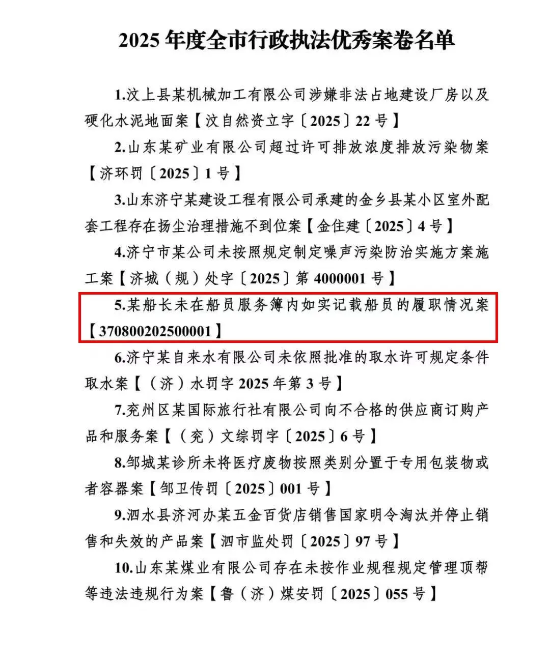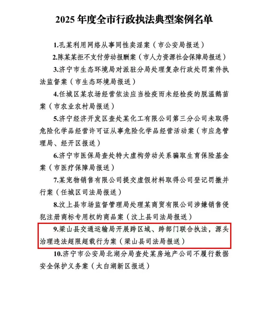 近日,我市2025年度行政执法典型案例与优秀案卷名单正式公布,市县两级交通运输部门报送的《某船长未在船员服务簿内如实记载船员的履职情况案》《梁山县交通运输局开展跨区域、跨部门联合执法,源头治理违法超限超载行为案》从121篇行政执法案例及250本行政处罚案卷中脱颖而出,成功入选“双十佳”。