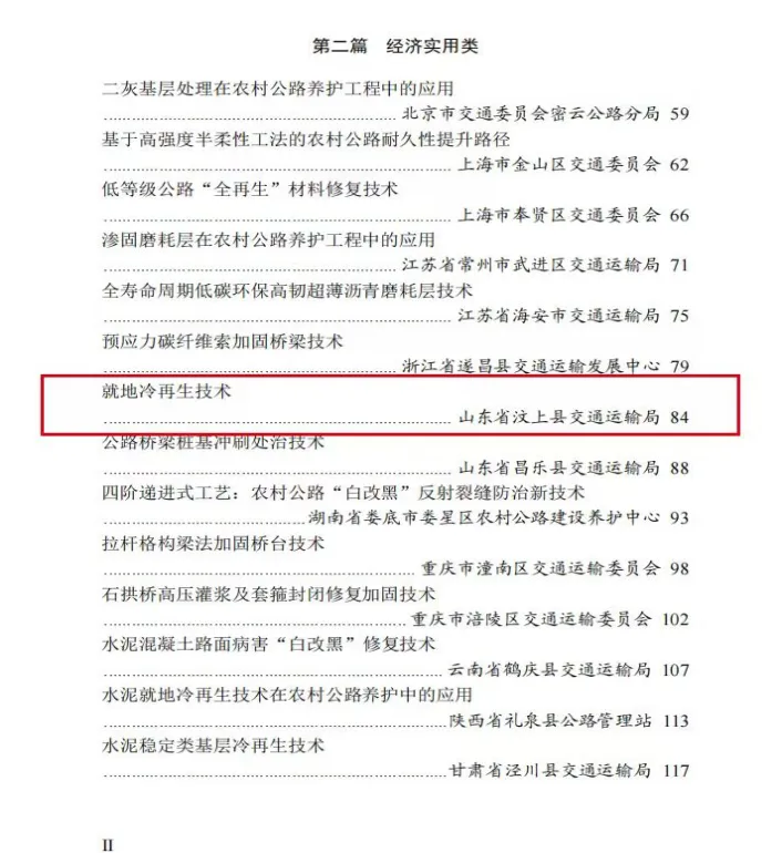 近日,为提升农村公路养护质量和效益,交通运输部公布了46个农村公路养护技术典型案例,其中,我市汶上县《就地冷再生技术》成功入选经济实用类典型案例,全省仅四例。