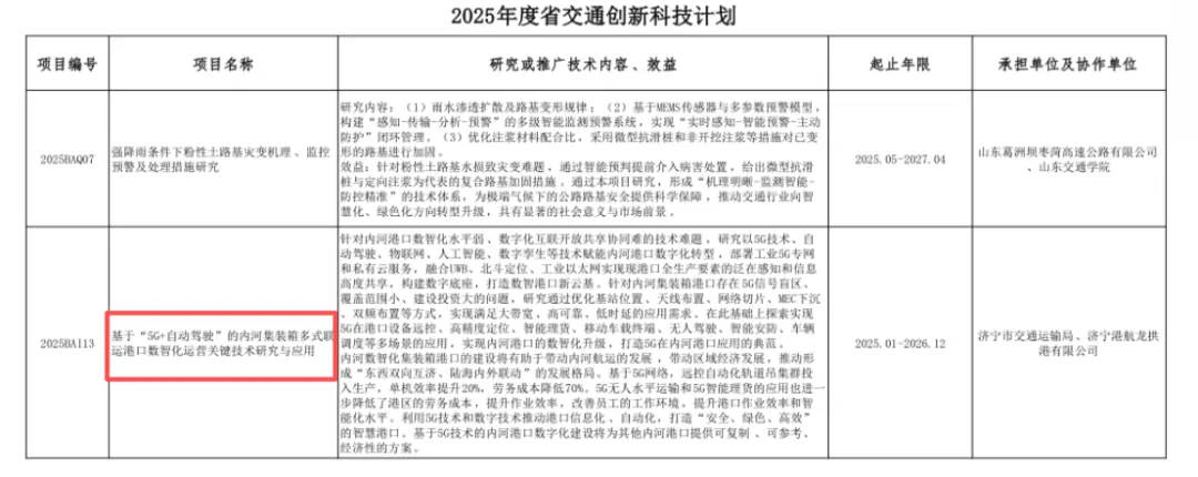 近日,省交通运输厅正式下达2025年度山东省交通运输科技计划项目名单,由济宁市交通运输局牵头申报的《基于“5G+自动驾驶”的内河集装箱多式联运港口数智化运营关键技术研究与应用》项目成功入选,标志着我市在智慧港口建设和内河航运数字化转型方面迈出关键一步。